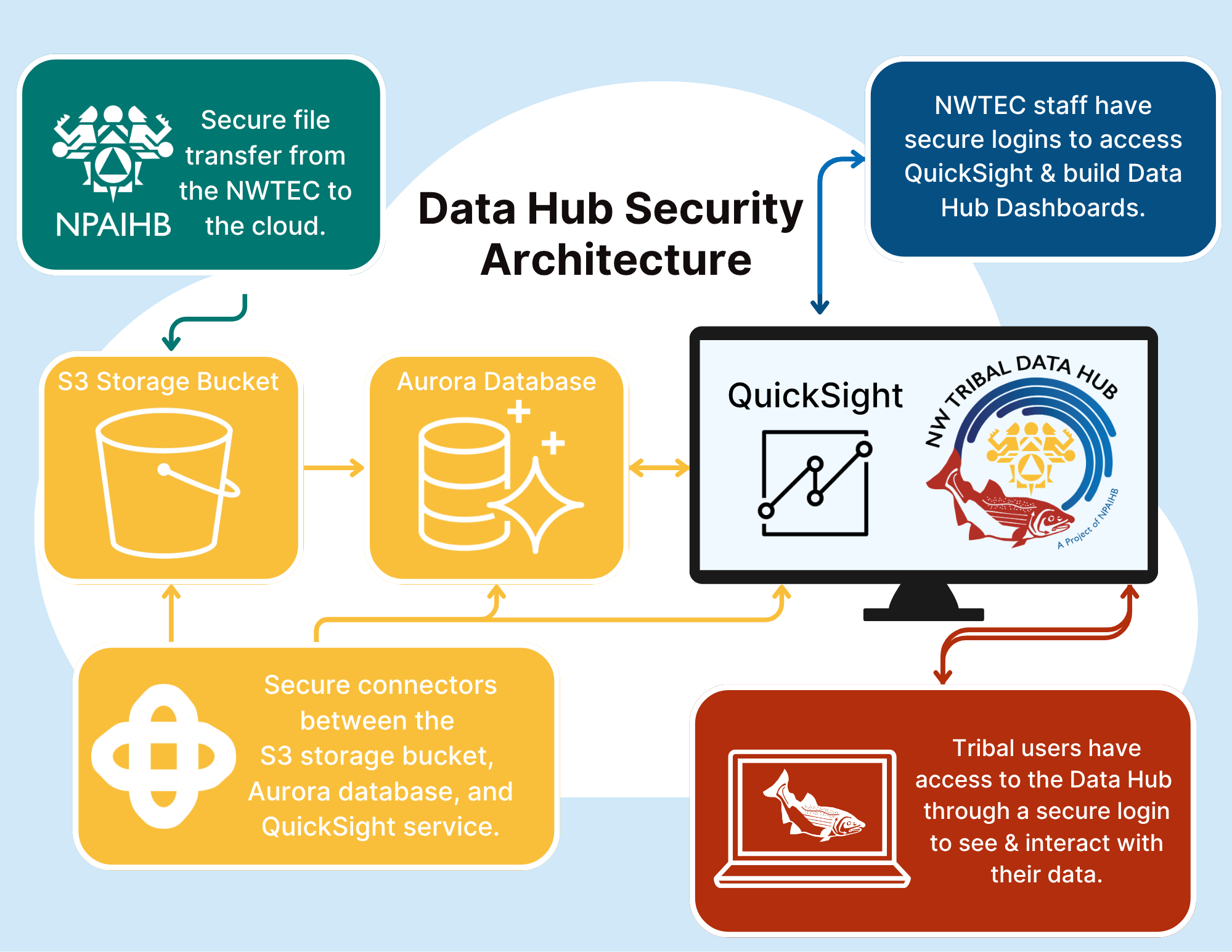 Data security and protection are vital for supporting Tribal Data Sovereignty. As data stewards, the Northwest Portland Area Indian Health Board (NPAIHB) works to ensure the protection of Tribal data. Amazon Web Services (AWS – the cloud platform that hosts the Data Hub), NPAIHB, and Tribes all play a role in ensuring the security of the Data Hub. AWS protects the security of the cloud by ensuring the physical security of hardware and the technical security of the software. NPAIHB protects the security in the cloud by ensuring sound security design and architecture, encryption of data, and industry best practices in identity and access management. Tribes can protect and secure their dashboards by coordinating user access with NPAIHB.